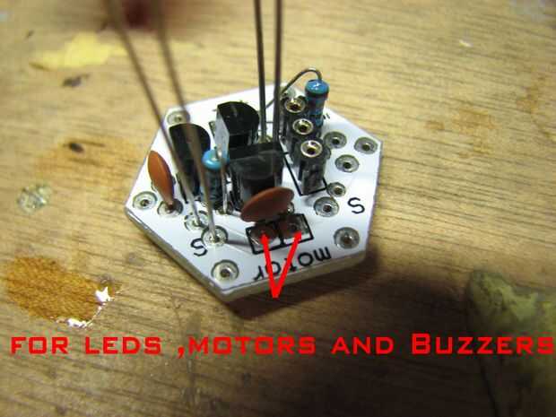 hay una etiqueta de "motor" uno el PCB, podemos conectar motores, leds y zumbadores aquí