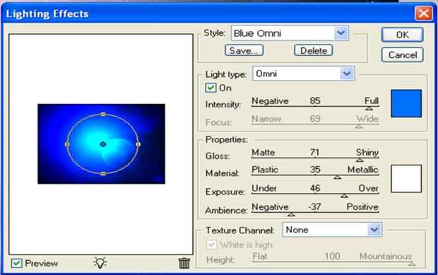 3: Ahora vaya a la caída de "Estilo" de la barra en la parte superior de los efectos de la iluminación de la caja y haga clic en "Omni azul". Foto dos para esta muestra de paso el cuadro de efectos de iluminación debe parecerse ahora.