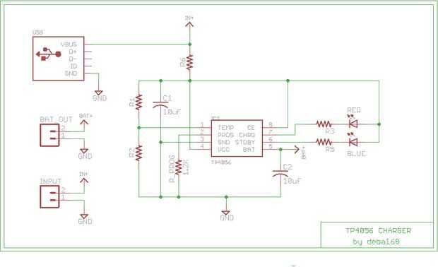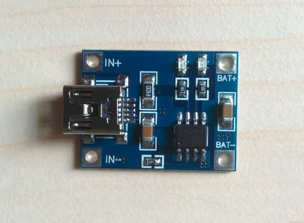 El cargador se realiza mediante un TP4056 de IC más populares. El IC TP4056 es un completo cargador lineal constante corriente/voltaje constante para solo baterías litio-ion/litio polímero (LiPo/LiIon). Su paquete de SOP-8 y bajo componente externo cuenta hacen la TP4056 ideal para aplicaciones portátiles. Si asusta sobre el SMD que suelda, no te preocupes. Somos tan afortunados que listo para usar TP4056 los módulos están fácilmente disponibles en eBay con precio muy bajo. TP4056 puede trabajar dentro de adaptador del USB y de pared. Otras características incluyen monitor actual, con bloqueo de voltaje, recarga automática y dos pines de estado para indicar la terminación de la carga y la presencia de un voltaje de entrada.