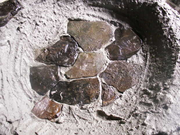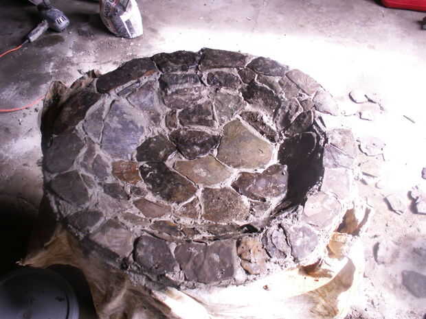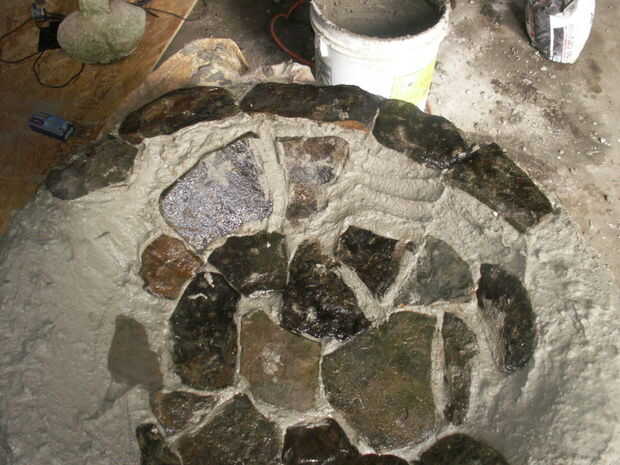 OK antes de que endurezca el dment obtener más de sus rocas planas y empezar a presionar a la mezcla de cemento. Trabajar las rocas al igual que hizo antes de comenzar en el centro con las rocas más grandes primero y trabaja su camino hacia fuera, entonces hice un borde con algunas piedras finas en la parte superior.