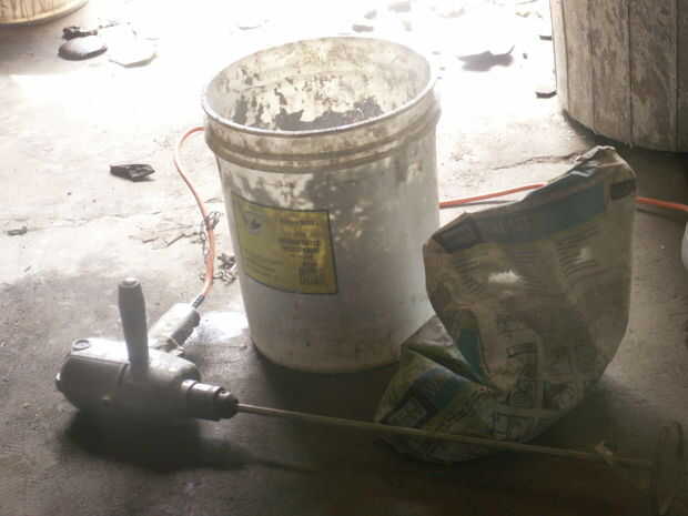 OK mezcla la mezcla de cemento/boquillas/rápidas, con el taladro en un balde de 5 galones.