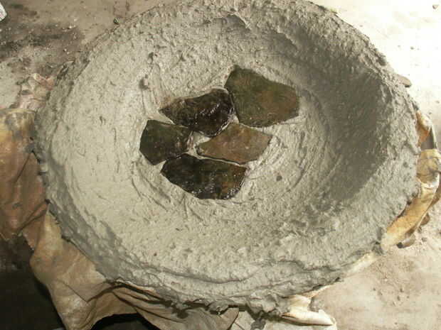Es el momento para manchar el cemento alrededor de la parte superior de las rocas hasta que tienes una forma de tazón de fuente que viene arriba a los lados y es por lo menos 1/2 espesor en todo el recipiente.
