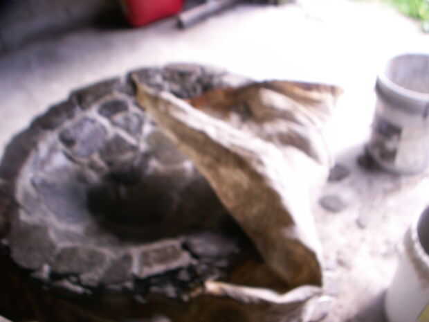 Tome un puñado de la mezcla de cemento y plobp en la parte inferior central, asegúrese de obtener una capa de 1/2 de mezcla, usted debe plop en las rocas muy gruesas antes de empezar a manchar en la forma de tazón de fuente. Si no tienes una buena capa antes de empezar a hacer la forma del tazón de fuente, usted recogerá las rocas con el cemento y esto arruinara.