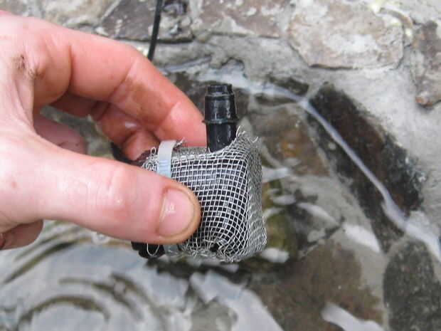 Ya que tengo un montón de árboles de pino alrededor de las agujas de engancharse en la bomba así que tomó algunas mallas y envuelta de la bomba con una atadura.