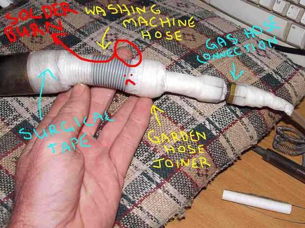 Resumen: Yo viajaba en la parte posterior de la vertiente y se reunieron todos los tubos y bitz que pensé que serían útiles y comenzaron a encajar una clavija cuadrada en un agujero redondo. Terminé usando un pedazo de tubo de una vieja lavadora, un conector de manguera de jardín, un pequeño trozo de tubo de 1/4 de pulgada y un inyector de gas de cobre amarillo y los montones de la cinta quirúrgica. Prendí el ventilador y tiene una agradable brisa de aire fuerte en el extremo de la tubería. El diseño se fija para arriba más adelante sobre las obstrucciones del flujo de aire etc. que existen con este artilugio. Mi objetivo es trabajar sobre el efecto venturi para aumentar aún más la salida de aire en la boquilla sin aumentar la velocidad del ventilador. Yo entonces simplemente conectado el tubo pequeño en la entrerrosca que sale de la empuñadura de hierro de la soldadura.