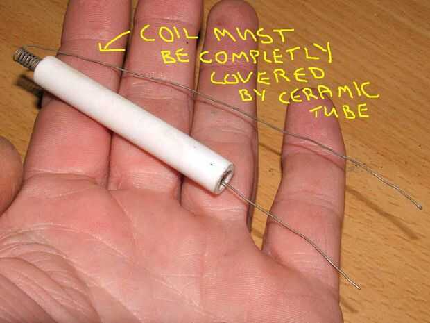 Resumen: En primer lugar, necesitaba un elemento de calefacción. Pensé que podía bajar tamaño nominal las resistencias rotas para 240 voltios AC para caber dentro de la tubería de cerámica y que correr tranquilo en doce voltios. El amperaje era un tema que preocupa y podría fijarse variando la longitud de la bobina para conseguir la salida de calor deseado. Demasiado la bobina y necesito utilizar más voltios o amperios... demasiado poco y sobrecalentamiento de la bobina y coloque el enlace. He experimentado con unas longitudes de bobina utilizando energía de mis baterías de plomo 12 voltios pequeño y encontró una longitud que desprende bastante calor (145 grados centígrados) como una figura a partir. He insertado la bobina en el tubo de cerámica, asegurando que no tenía curvas y longitudes suficientemente largas de alambre de la bobina. Los largos eran para darme espacio para jugar con cuando voy a montar a este bebé dentro del eje de mi soldador. También los largos me permitieron colocar el elemento de calefacción más lejos del mango de la tenaza. Parece que el hierro de la soldadura completa se hizo para ser inversa diseñado para uso con flujo de aire caliente. Veo que otras personas en la web han tenido pensamientos similares.