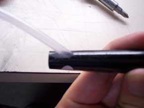 Esto demuestra el tubo por el agujero que creó en el soldador. La colocación de este agujero parece realmente superior a la ejecución de la línea recta hacia la parte posterior de la plancha. El flujo de aire puede ser regulado crudamente con un poco de presión, pellizcando la manguera de aire contra la manija.