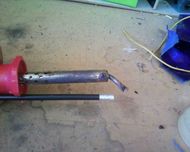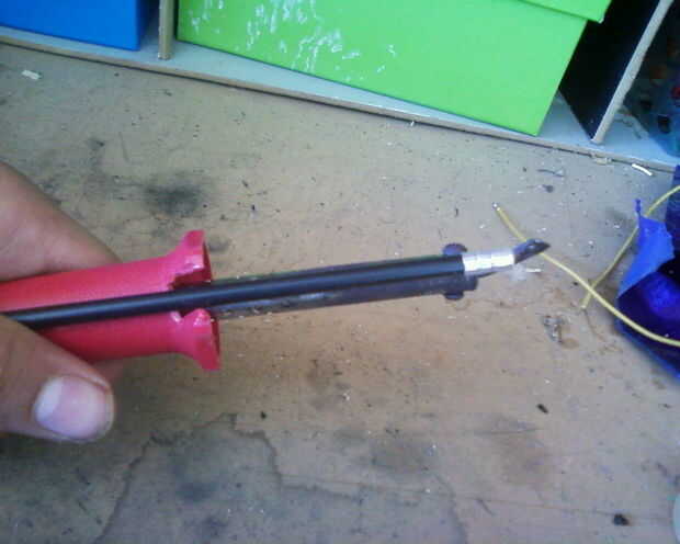 Córtelo de manera que puede ser pegado en la parte de arriba y que la punta se pone cerca de la punta del soldador. La parte de abajo se corta de manera que la punta está en la misma longitud que el soldador y deja un espacio entre las dos partes.