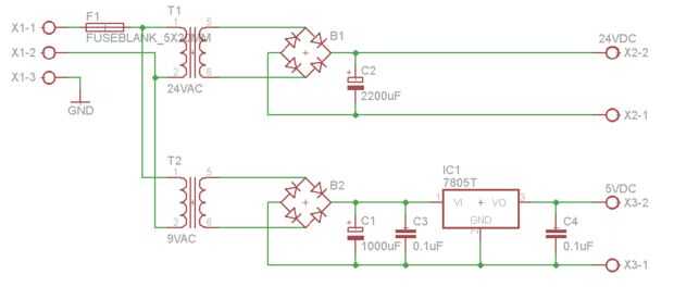 3) he utilizado un regulador de voltaje LM7805T con algunos condensadores a 9VDC a 5VDC para alimentar el tablero de control con todos los componentes de lógica.