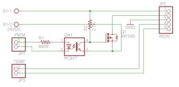 El segundo esquema muestra cómo vamos a controlar nuestro calentador de cerámica: adquiere la señal PWM del microcontrolador ATMega y enviar a través de optoacoplador PC817 a la puerta del mosfet IRF540.