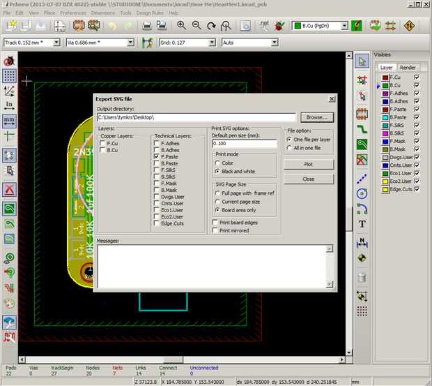 crear una plantilla de pasta de soldadura para un horno de reflujo o placa caliente es simple cuando usted tiene acceso a un cortador del laser. Usé el cortador del Laser en mi local TechShop para crear esta y otras plantillas de PCB.Este Instructab