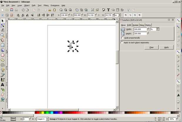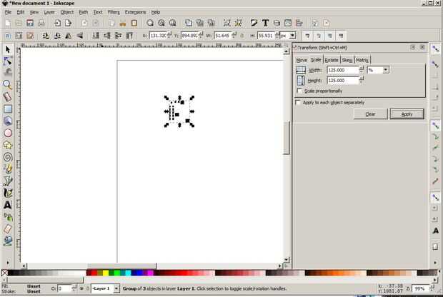 Abra el archivo SVG de KiCad en Inkscape. Otra mención de tutoriales, cambiar el tamaño del archivo en un 125%, lo es lo que hice. Esto requiere seleccionar todo (ctrl-A), ir a objeto, transformar, escala, y luego aplicar un aumento de 125% en tamaño.