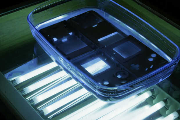 Sucede que tiene una muy buena unidad de exposición UV DIY, que hice hace un tiempo para exponer las plantillas de impresión de la pantalla. Es perfecta ya que permite una amplia exposición a los rayos UV y de una manera muy concentrada. He intentado usando el sol pero era verano y extremadamente caliente afuera, así que estaba preocupado por la fusión de plástico y lo llevó dentro.