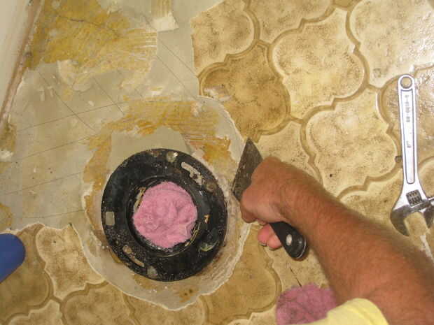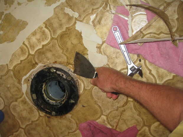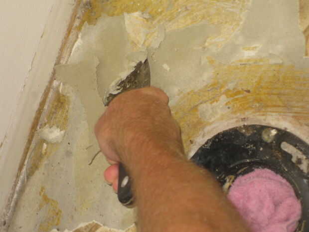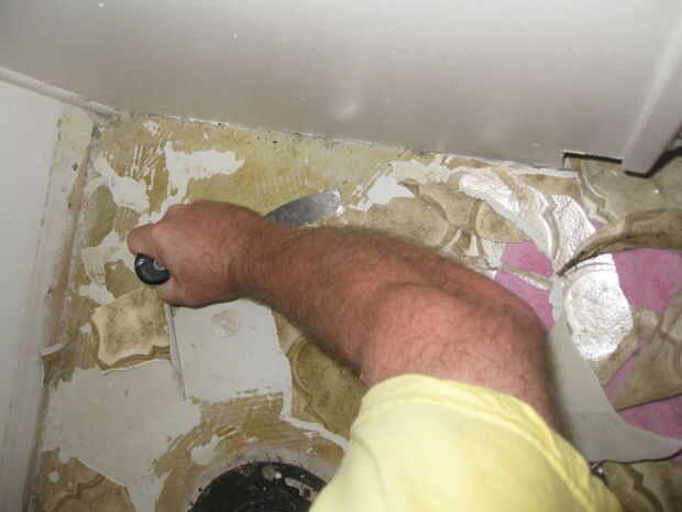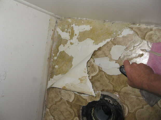Si su confusión por el título de este paso me explico. Antes de 1978 (por lo menos en Alberta) se utilizó amianto en el soporte de papel aplicado a la parte inferior del linóleo, así que a menos que le sucede que tiene que remover asbesto completo engranaje poner alrededor no levante su linóleo si su mayor de 1978. Casa de mi Nana fue construido en 1979 por lo que decidimos no arriesgarlo y en lugar de corte al hilo hasta el viejo linóleo decidimos recortar los trozos de peladura y luego poner los azulejos encima del linóleo. Comenzar haciendo su investigación para ver si se debe quitar el linóleo. Después de que se establece quitar las tablas del suelo (si hay alguno) y comenzar a peel/rip lejos el linóleo. Dependiendo de cuánto linóleo su eliminación esto podría tomar tanto tiempo o un paso rápido de vary. Limpiar cualquiera de las cosas en el baño y tirar el viejo lino.