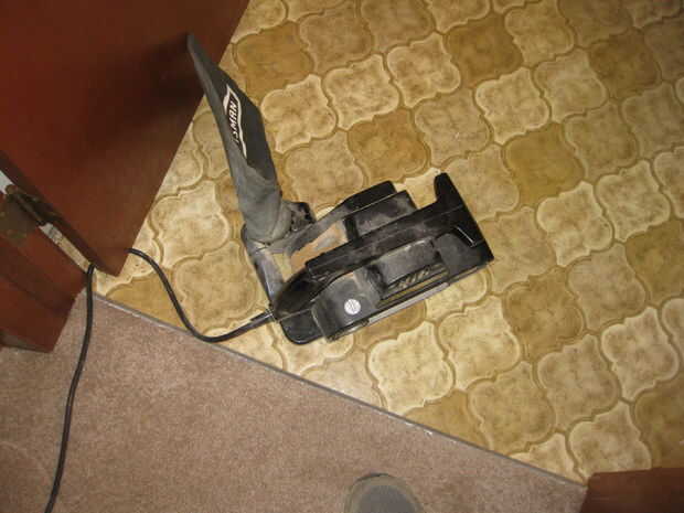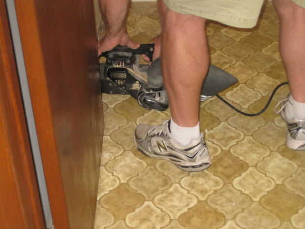 Continuación ejecute una lijadora sobre el linóleo para ayudar con la adherencia del mortero. Use una máscara antipolvo, el amianto no es en la parte superior del linóleo por lo que no necesita trajes de peligro bio completo. Luego parada para un descanso de la Pizza, sin embargo esto no es necesario.