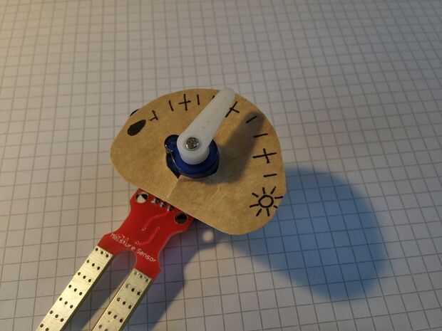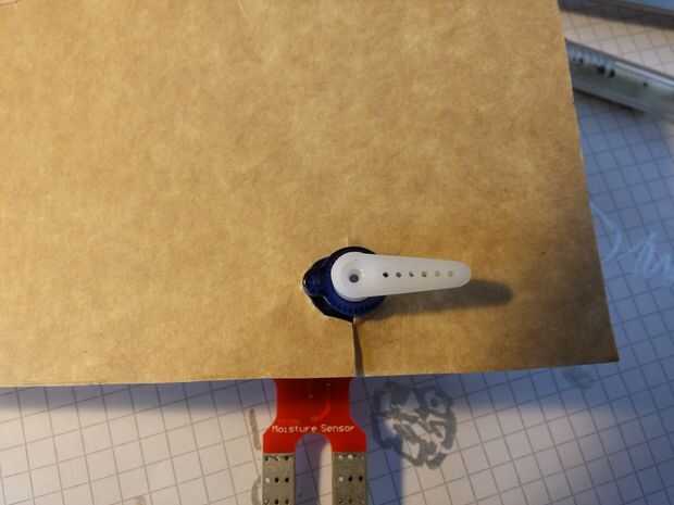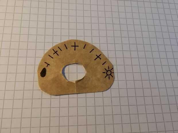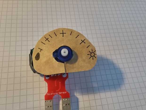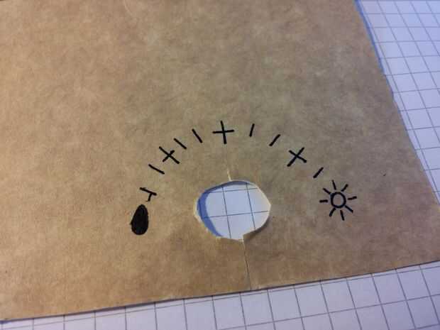 Comencé cortando un pedazo de cartón que se sujete con fuerza el servo. Entonces, dentro de 180 grados que dibujé en un símbolo del sol que indica el suelo seco y una gota de agua que indica el suelo mojado. También he añadido unas líneas del indicador entre estos símbolos para mostrar cuán seco o en húmedo el suelo es.