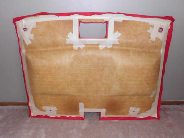9. pegamento - cola realmente el tapizado del techo a la placa de soporte de fibra de vidrio. Asegúrese de eliminar cualquier burbuja de aire. Ser deliberadas acerca de cómo se pone a la tela abajo y alisar hacia fuera las burbujas. Lo último que desea es un nuevo cabeza de cartel con las arrugas! NO SE APRESURE ESTE PASO! (Tiempo de secado del pegamento blanco es aproximadamente 60 minutos)