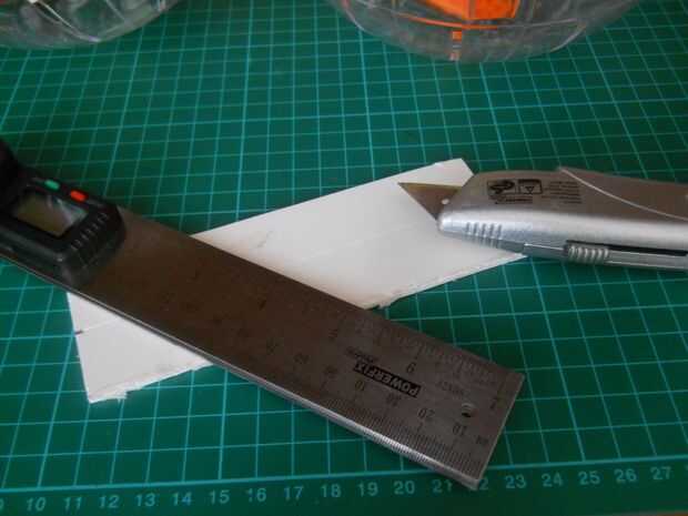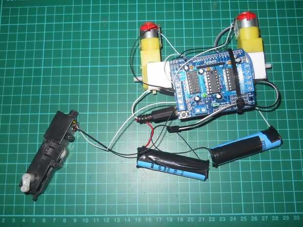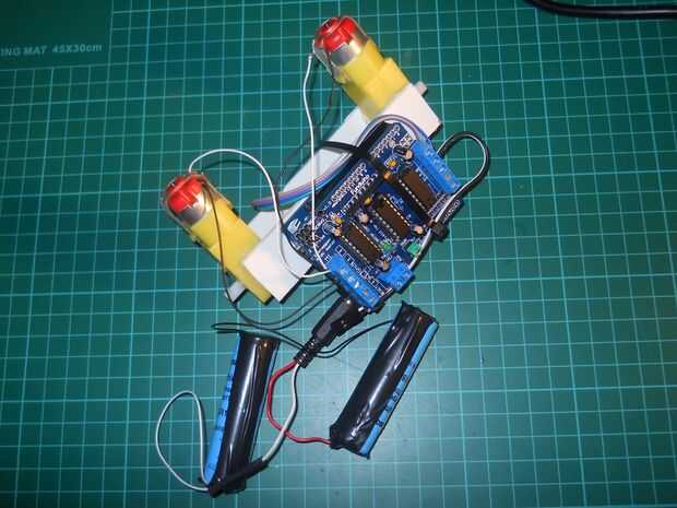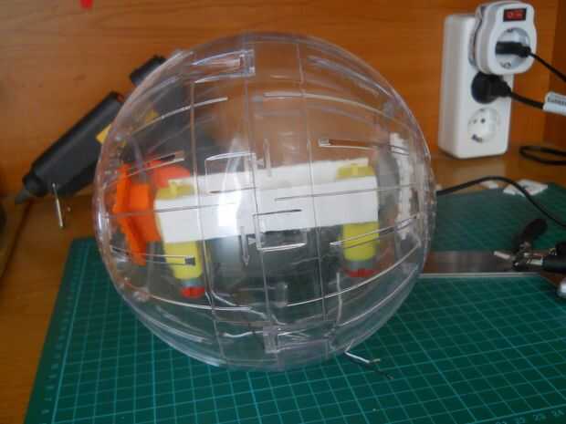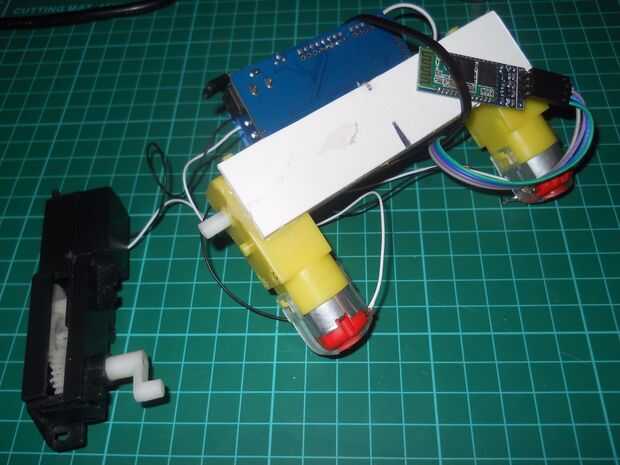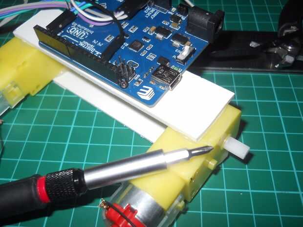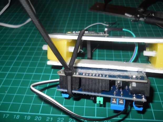 Esto es una parte delicada: cortar dos piezas de plástico y pegamento a los motores. El diámetro de mi esfera es 17cm usé un trozo largo de plástico de 13cm. Fue perfecto para mi droid. Mientras trabajaba he quitado el escudo del motor por un corto tiempo. Con ome tornillos y un zip ate siuted el microcontrolador para el cuerpo. El cordón tiene el Arduino y el módulo bluetooth en su lugar. Las baterías se instalará más adelante.