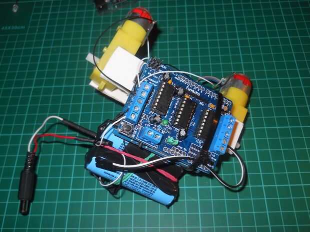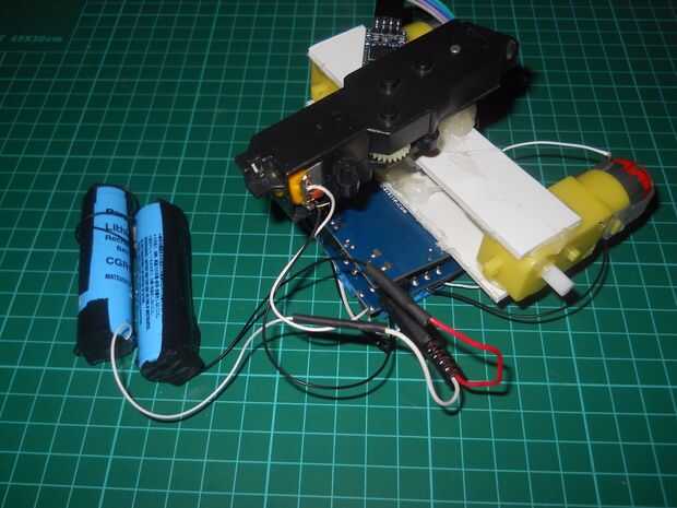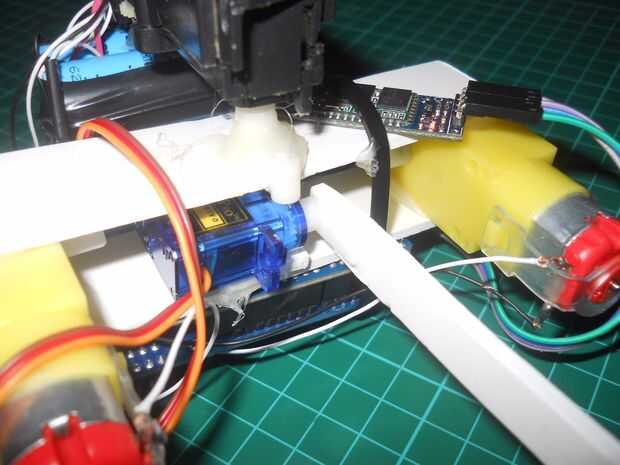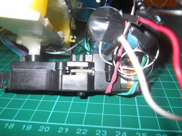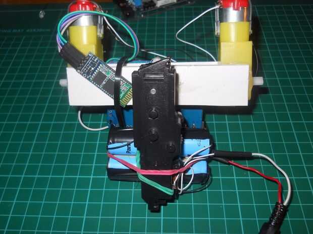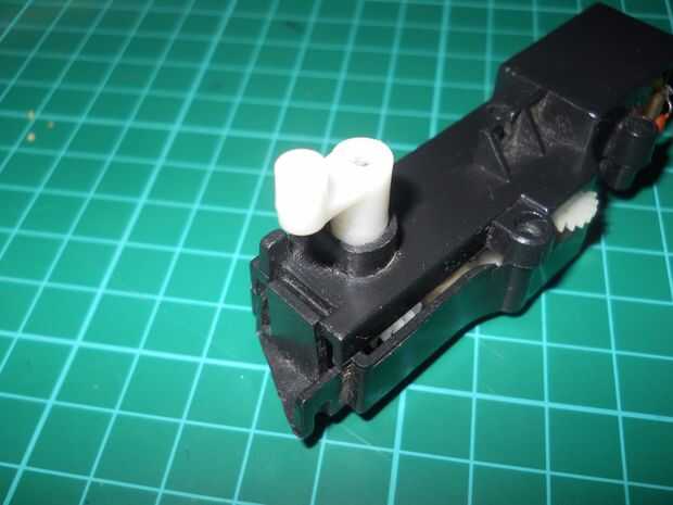 Ha llegado el momento, utilizar la fuerza o la pistola de pegamento y pegamento ese tercer motor en el cuerpo. Como se puede ver el motor y el sistema de engranaje es libre, sólo el final, la parte móvil se pega al cuerpo. A ese negro sistema motor conectamos las pilas. Los dobles de las baterías como fuente de energía y peso para el volante.