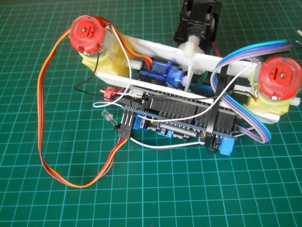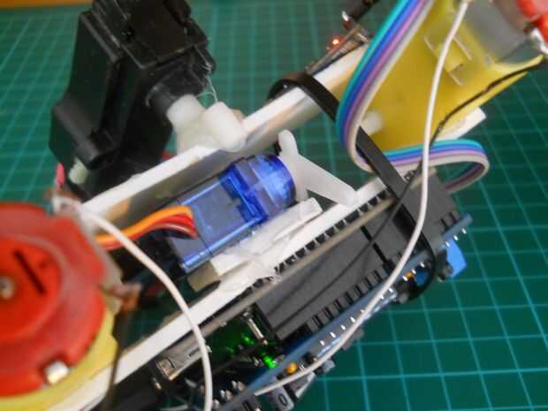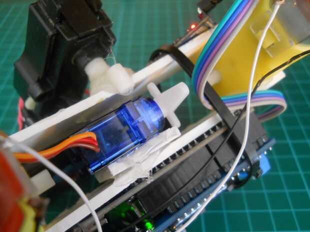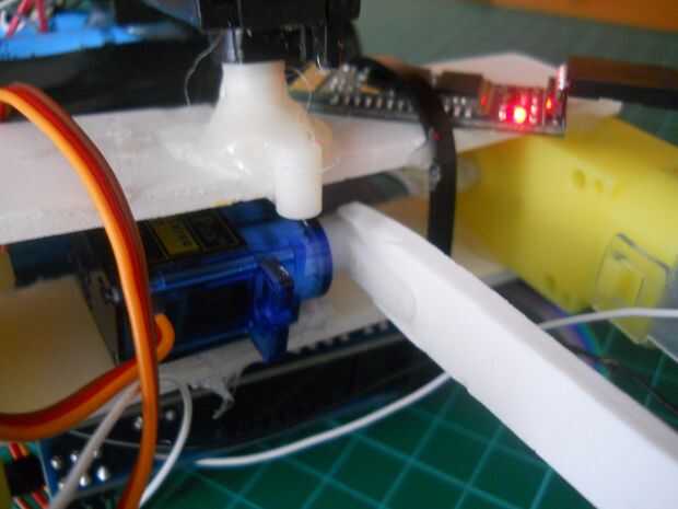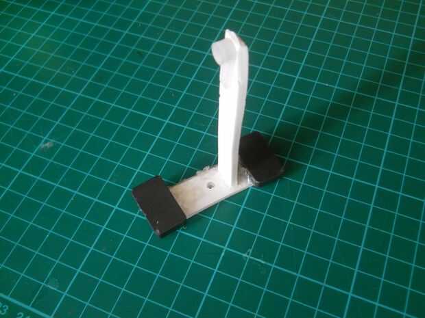 El papel del motor servo debe o inclinar la cabeza sobre la esfera. He utilizado pegamento caliente otra vez y había pegado el motor en el centro del cuerpo. Luego con poco de plástico y dos imanes he creado un elemento de explotación. Este palo tendrá la cabeza en la parte superior en un solo lugar.