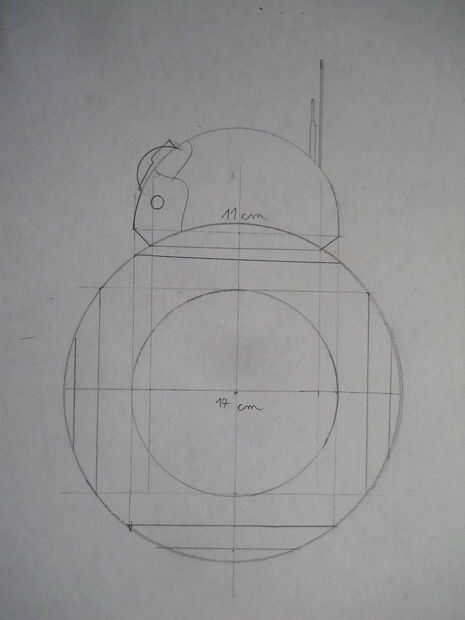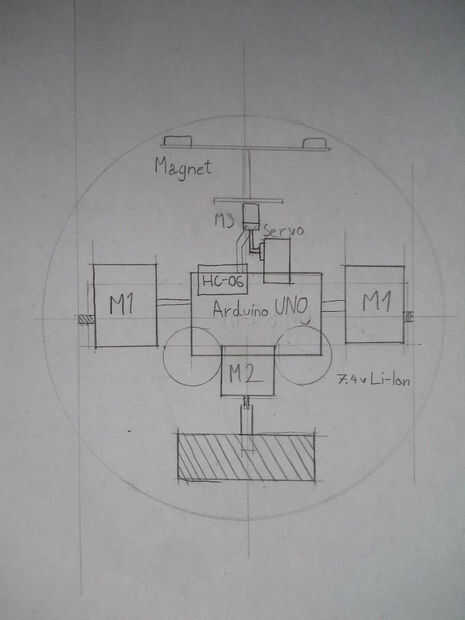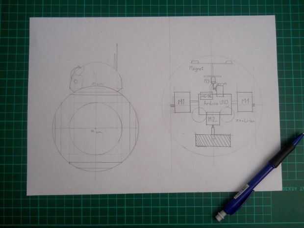 Hice algunos dibujos sobre mi plan. Usé un globo de cartulina para la cabeza y una bola de hamster plástico para hacer que el cuerpo. En este hámster bola se coloca el Arduino y los motores. El M1 (motor) se mueve el droide hacia adelante y hacia atrás, la M2's función es girar el cuerpo izquierdo o derecho. A la M2 se debe conectar algo de metal o cualquier cosa que tiene gran peso, lo contrario al droide no será capaz de girar a la izquierda o derecha. Como un peso simplemente usé las dos baterías, para no añadir peso extra. Más adelante explicaré este featurette. El Servo mueve la cabeza en el avance del cuerpo y hacia atrás y el M3 da vuelta la cabeza izquierda o derecha. El cabezal puede fijarse al droide con imanes.