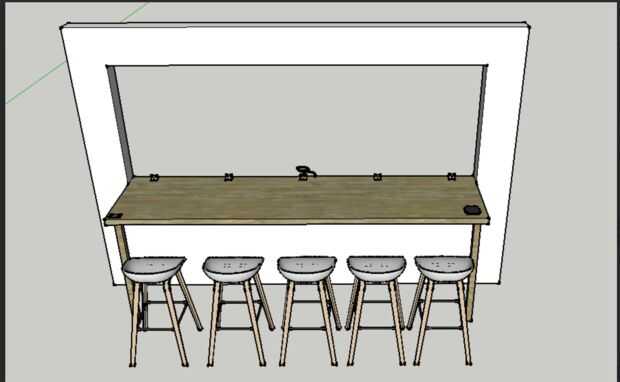 La bartop será 10 pies por 24 pulgadas. Habrá cinco carga puertos espacios separados, dos pies tres opciones de cargador en cada puerto. Espaciamiento permitirá trabajo y comer espacio. Habrá un cargador de iPhone 5, micro cargador USB y un puerto USB para cualquier otro cargador que no se suministra. Al final de la bartop allí será un wireless cargar cojín para los teléfonos que le permiten (cargador Qi).