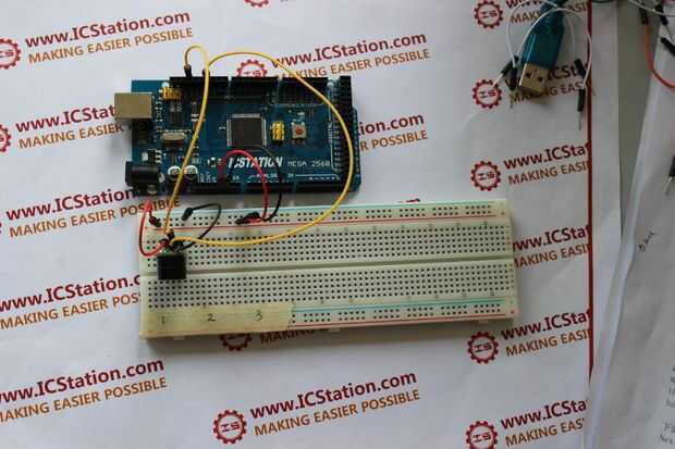 En el módulo zumbador activo a la Junta de pan y conecte a la Junta de desarrollo de ICStation Mega y fuente de alimentación y tierra