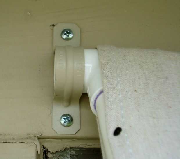 Con la tela con tachuelas, el siguiente paso es colgar el toldo de la parte superior. Para esto necesita haber utilizado de T en las esquinas superiores. La pequeña porción de la T que se extiende desde la lona se utiliza para fijar el toldo. Ir a la nave eléctrica y obtener 3/4" abrazaderas de conducto. Me preparado y pintado de mina para que coincida con el color de la casa. (Tenía la pintura en aerosol ya.)