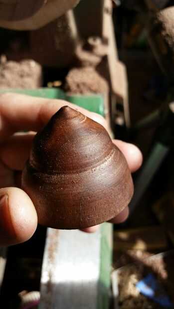 3. Gire el perfil exterior. cuando puede caber el centro vivo en la madera todo el camino sin ningún cuarto de meneo, mantenerlo mientras gire el contorno exterior que desee. Me gusta un cono afilado para encajar en un agujero, como en la imagen. algún día voy a hacer uno con una cara plana para mantener las cosas en una espiga en el cabezal.