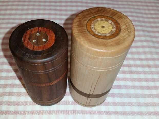 todas las herramientas hechas para mi torno hasta ahora me ayudaron a crear esta coctelera de sal y pimienta. de aburrida a los círculos pequeño corte en la parte superior, incluso haciendo tapas madera apretadas para los fondos utilizando el método de la espiga.