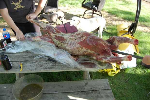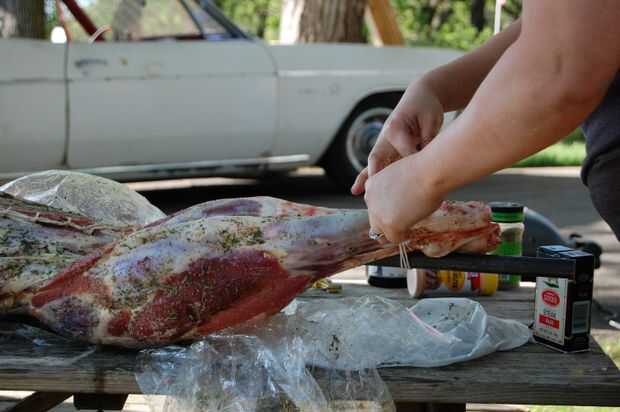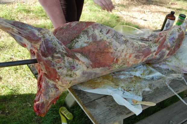 • Para obtener el cordero en el asador, utilizamos los orificios en el cuello a los glúteos, dejando aproximadamente 5" de escupir en cualquier lado. Esto por supuesto dependerá del tamaño de su cordero y la longitud del espetón que tienes.