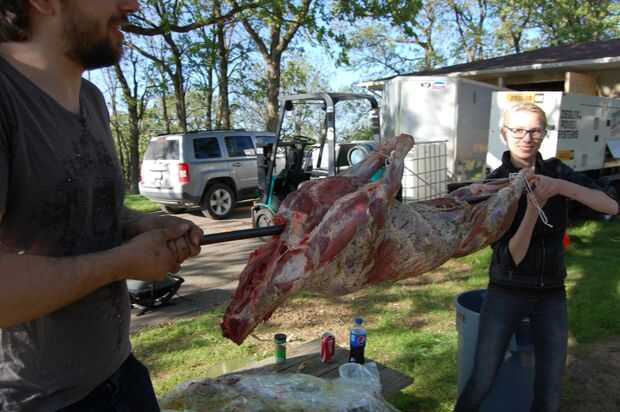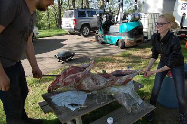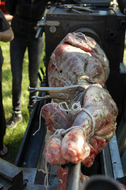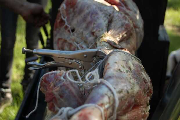 • Si usted no han escupido spears soldados sobre el asador (ayudan a mantener la carne rota con el espetón en lugar de sólo el asador giratorio), luego use abrazaderas como lo hicimos! Añadimos las abrazaderas a la región del cuello, la región de la pierna trasera y el área de la costilla. De esta manera, cuando el cordero no rotaban con el asador, quedar atrapados por el mango de la abrazadera y girar de esa manera. Un poco torpe, pero funcionó!
