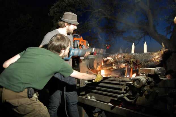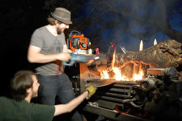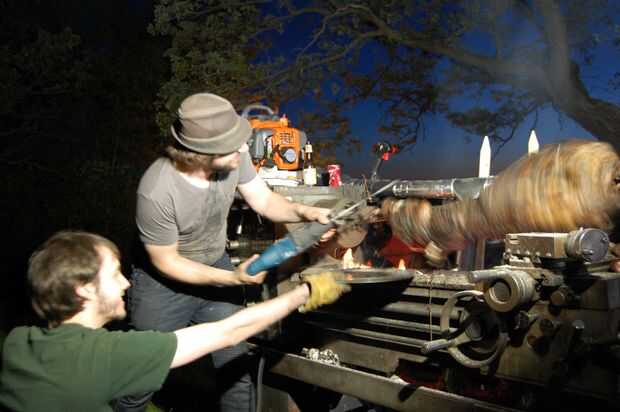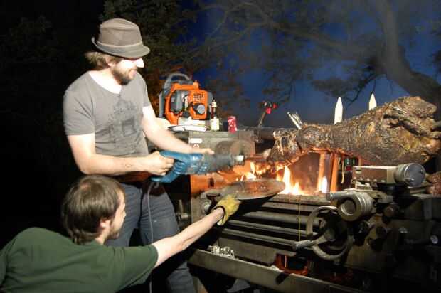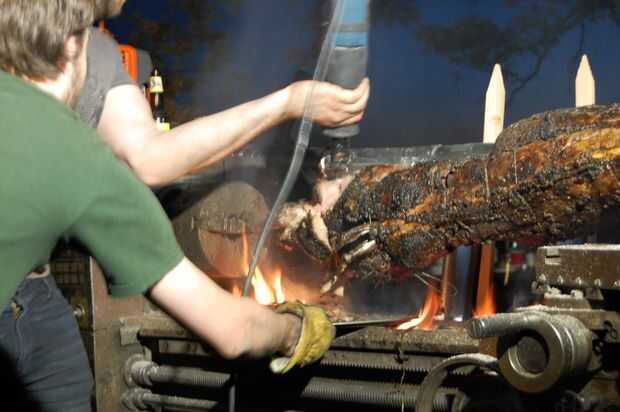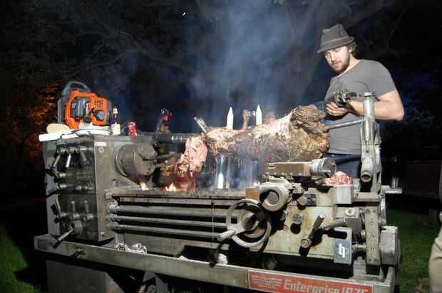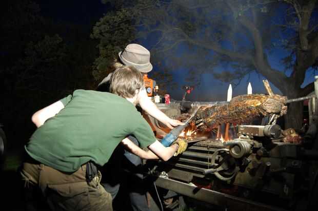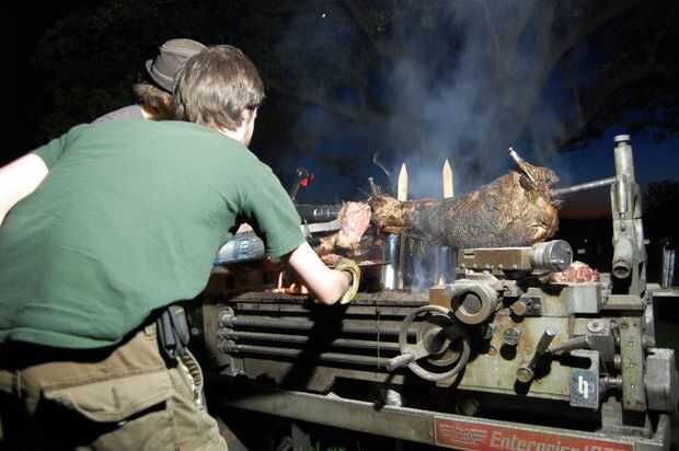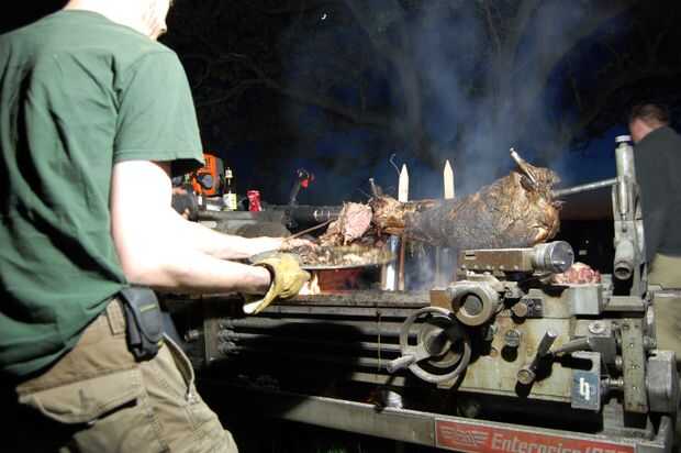 Generalmente, usted querrá dejar el resto de carne unos 15 minutos antes de cortar pero decidimos que sería más adecuado tallar usando una sierra de sable. Así nos detuvo temporalmente el torno para tallar un poco de carne y entonces comenzó otra vez spinning.