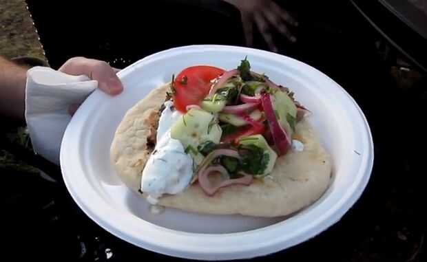 Tomar el pan de pita, poner alguna salsa tzatziki, alguna ensalada griega deliciosa y luego unas lonchas delicioso de cordero! ¡ Disfrute!