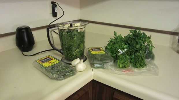 - Mezcla 2 Ramos de romero fresco, perejil y albahaca junto con los dientes de 2 cabezas de ajo hasta formar una pasta (esto puede ser hecho el día antes de usted es el cordero asado y almacenado en un envase tupperware).