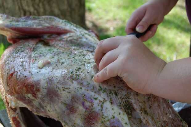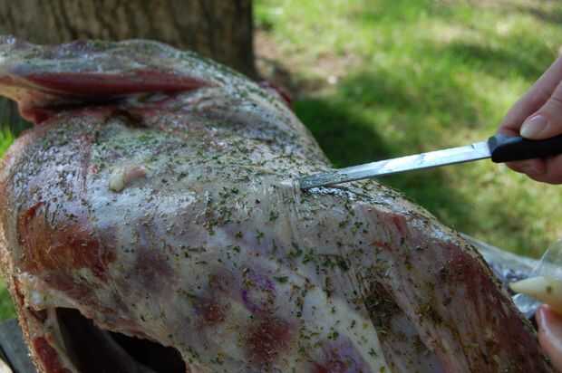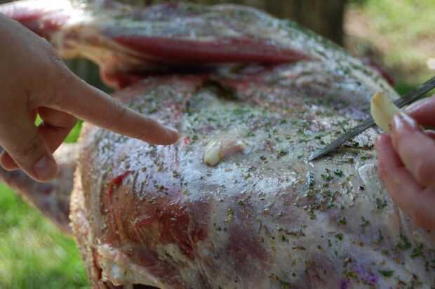 • Corte ranuras en la sección exterior/piel de cordero e inserte rebanadas de ajo. Se necesitarán unos 3/4 de una cabeza de ajo por cada lado.