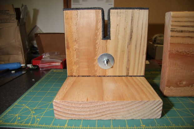 Perfore el agujero de 5/16", justo debajo de la ranura. en la pieza superior de la madera.