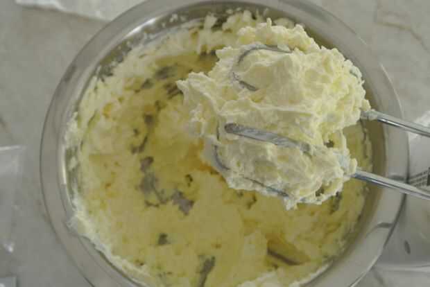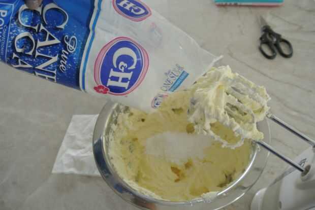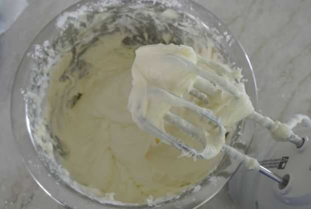 Batir todos los ingredientes excepto el azúcar hasta que esponje. Luego, gradualmente añadir el azúcar hasta que quede suave.