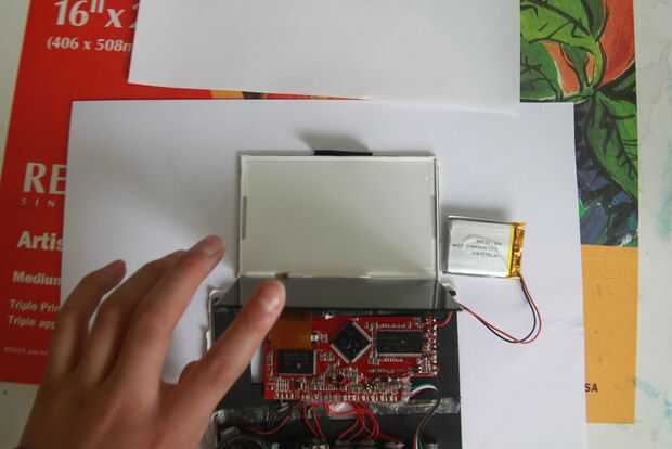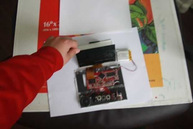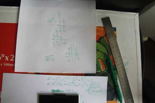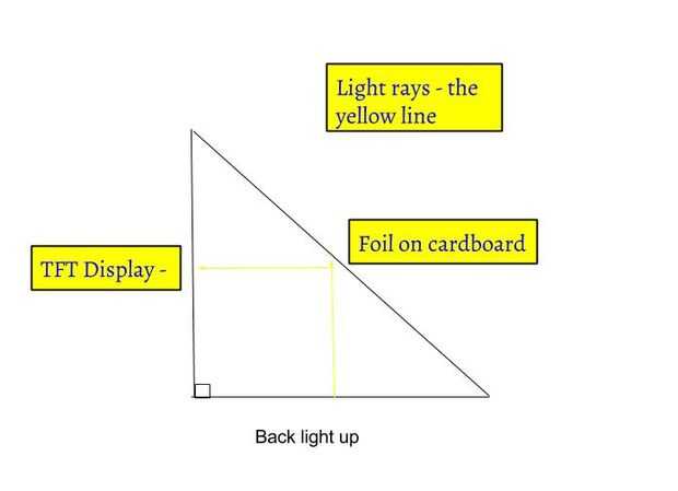Su pantalla TFT debe tener un pedazo de vidrio que se puede mover al lado en un ángulo, poner a un ángulo de 90 grados, para que la luz es perpendicular a la pieza de vidrio. Ahora que la pantalla está en su lugar, puede encontrar la longitud y el ancho de la pieza de papel y cartón que se estar reflejando los rayos de luz. (Utilizar el teorema de Pitágoras). En el próximo par de cuadros, me muestra la primera parte de la TV del edificio. No tienen las mismas medidas exactas como me, así que primero medir la longitud y el ancho y hacer el pedazo de papel con algún tipo de estabilizador. Como se puede ver como la última imagen de arriba, tengo el pedazo de papel cortado con tijeras y está listo para poner en estabilizador de s. Para el estabilizador, utilicé cartulina y pegadas en, también la podría grapa.