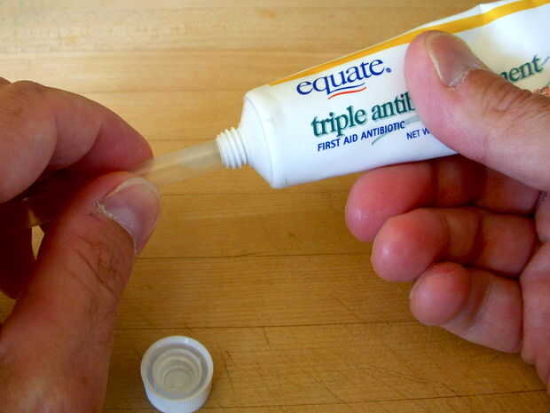 Colocar la paja sobre la abertura del tubo del ungüento y apriete con cuidado una pequeña cantidad de la pomada que es aproximadamente un cuarto de pulgada de longitud. Usted notará que pajitas transparentes funcionan mejor para esto.