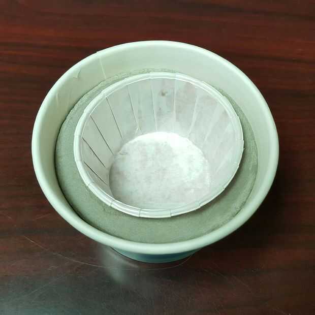 Mezclar el concreto a una consistencia de masa de panqueque. Verter el hormigón en la taza más grande. Presione la Copa más pequeña en la taza más grande. Asegúrese de no presionar la Copa más pequeña hasta el fondo.