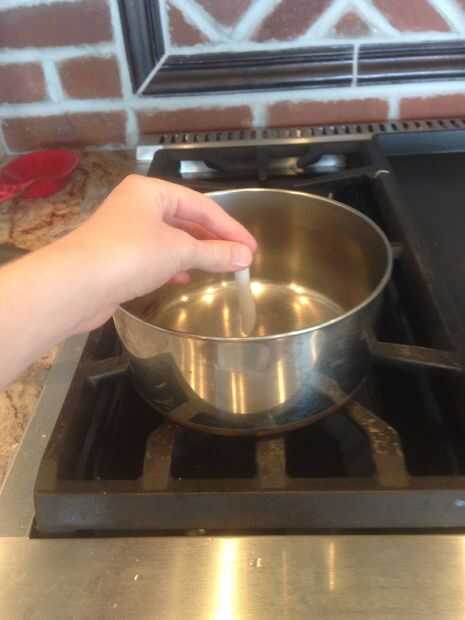 Una vez la cera está en ebullición bajo baje el calor. Ahora toma una mecha y sumerja en la cera remolinar alrededor un poco para distribuir la cera y luego el agua. Puede utilizar los dedos para moldear la cera, después de haber sumergido la vela en el agua, ayuda a enfriarlo.