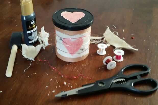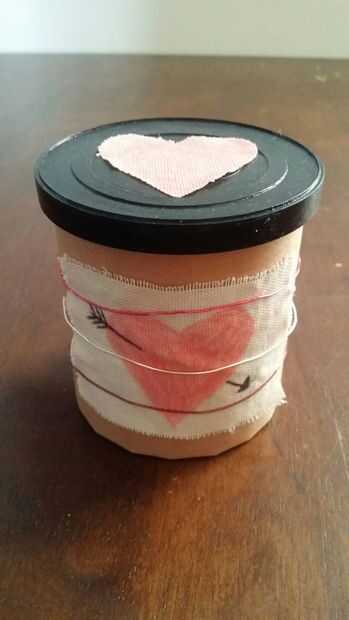 Empecé con una lata de betún que vinculo la etiqueta de, quería hacerlo bien, pero realmente no quería gastar tiempo o dinero en él por lo que he deducido rápidamente qué suministros de arte tenía y esto es la criatura que vino de él. He pegado un papel marrón constricción sobre ella (no tanto como haciendo un montón de rosa y rojo) y había pintado la tapa negra con la esperanza de que el logo de Pillsbury. Quería algún tipo de etiqueta de la can pero sentía como se vería más papel de construcción demasiado grado escolar así que corte un trozo de tela de otro proyecto en un pequeño rectángulo. Después de unos pocos rectángulos arruinados con mi mala letra colocó en un cuadro que hice con lápices de colores. También hice un corazón de tela para cubrir el logo en la tapa ya que la pintura no bastante. Por último, necesitaba poner la etiqueta de la tela; Tuve algunos alambre colorido que quise incorporar de alguna manera y decidió que este era el camino a seguir. Sé que no es mucho para mirar, pero era capaz de usar todos los materiales sobrantes y tardó como 5 minutos, que era mi objetivo, así que estoy contento.