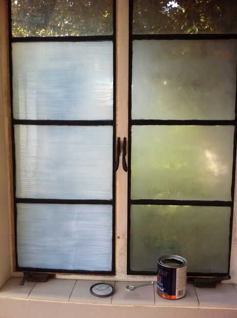 Super importante: Puede tomar hasta 2 días para que esto completamente seco. Usted debe esperar hasta que se haya secado completamente antes de colocar la capa siguiente o corre el riesgo de no construir las capas y obtener la privacidad que desea. Si la privacidad no es tanto un problema para usted, usted puede probablemente detener aquí. Para mí, estas son ventanas de calle y orientada al vecino por eso he querido 100% de privacidad mientras que hice algunas reformas y pintura.
