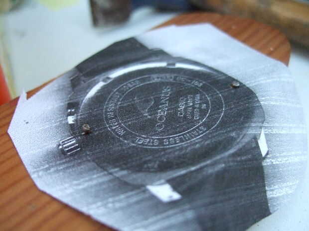 cuando la caja del reloj está apretada, una sencilla herramienta puede ser modelada por atornillar los 2 tornillos 'universales' en un pedazo de madera como se muestra en la imagen. Marcar la posición exacta y perfore 2 agujeros. Instale los tornillo