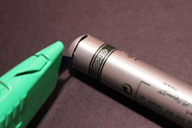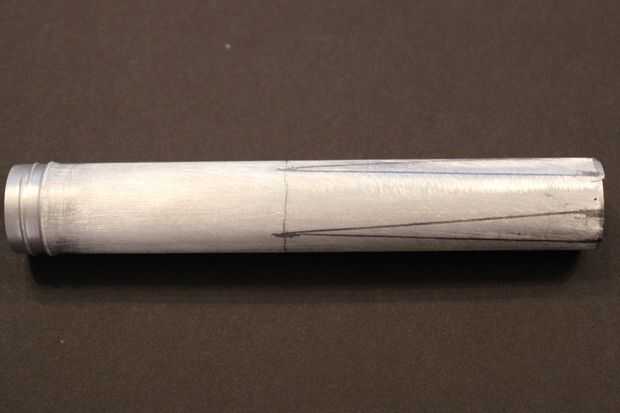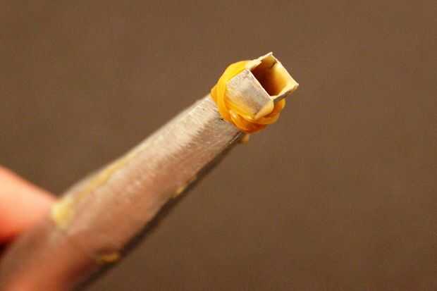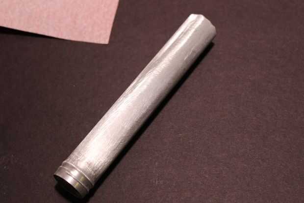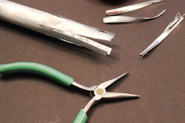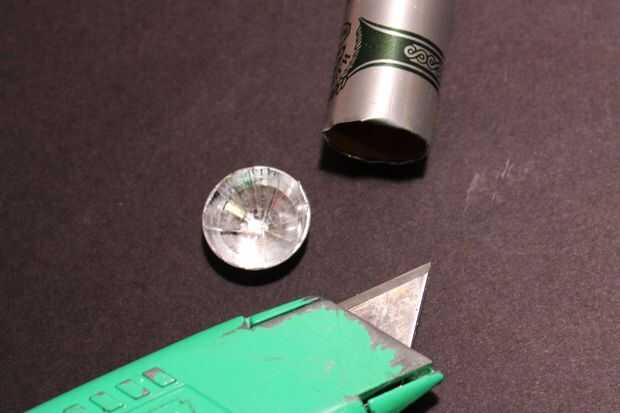 1. Corte la parte inferior del tubo de cigarro con un cúter. Utilice una hoja nueva y cortará fácilmente. La pieza inferior resulta para ver tipo de Star Wars-y, por lo que creo que puede tener para convertirse en el inversor de empuje parabólico en el propulsor del X-wing o algo. Luego aplana hacia fuera del borde de corte en el tubo con pequeños alicates de punta, que prensa alrededor de la circunferencia.