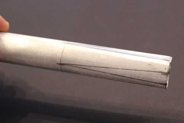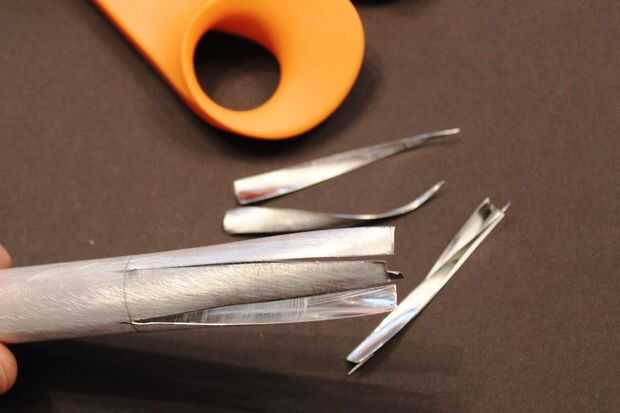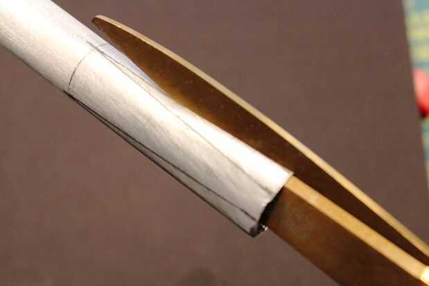 3. dibuje un círculo alrededor del tubo con un lápiz, unos a medio camino desde el extremo de la nariz. Luego marque las líneas de corte. Estamos reduciendo el diámetro hacia la nariz a medida que avanzamos, así que necesita cortar triángulos largo flacos y luego unir los lados hacia atrás. Hice 4 triángulos finos, espaciados igualmente alrededor del tubo. Ahora recorta los triángulos - utilicé mis tijeras de taller Fiskars y funcionaba bien.