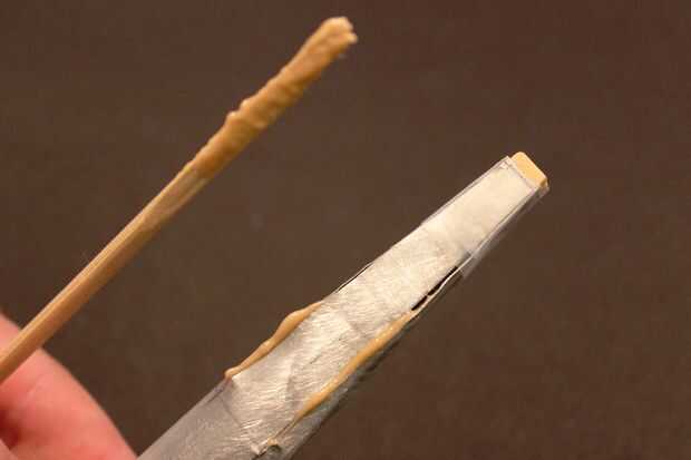 Cortar un pequeño trozo de goma del tamaño del nuevo extremo de la nariz y grabó junto a la nariz. Luego aplicar epoxi en el interior las juntas usando un pincho de bambú de parrilla, que seguro que alguna rezuma a través hacia el exterior. Ir a 3/4 del camino hacia la nariz - vamos a terminar desde el otro extremo una vez que esto se cura.