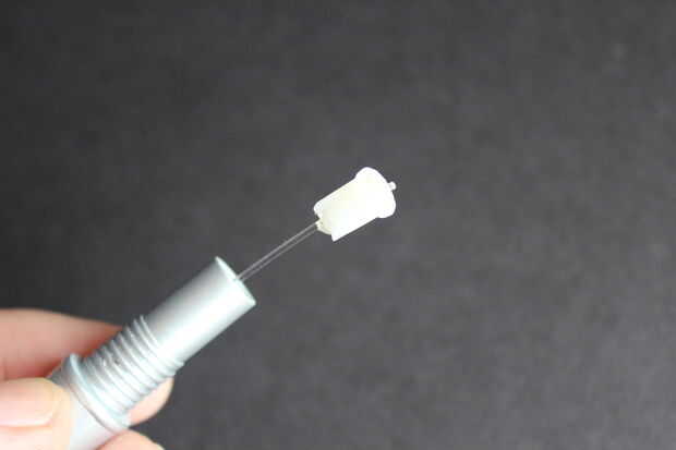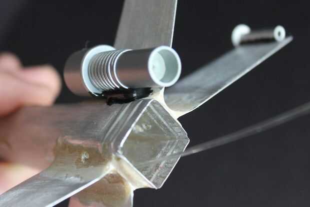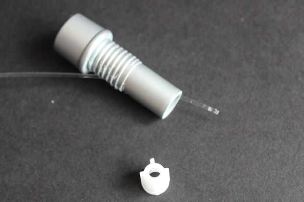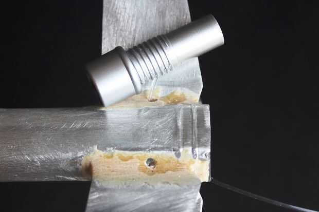 3. ejecutar las fibras del cuerpo a los motores principales. Usé un inserto de la pluma para mantener la fibra en medio de la apertura y un poco de pegamento caliente para mantener en su lugar mientras todo está pegado con epoxy.