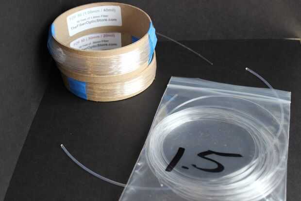 Pedí algunas fibras de diferentes espesores de la FiberOpticStore. Y un poco extra para jugar con. También consiguió algunos fibra 'glow lado' (que se ilumina a lo largo de toda la longitud, en lugar de 'resplandor final' que sólo brilla la luz del extremo de la fibra), pero no creo que se termina utilizando en este proyecto. Terminé yendo con la fibra de 1mm diámetro - el más grande podría caber a través de Q-consejos/armas.